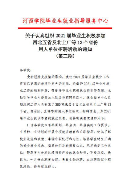 关于认真组织2021届毕业生参加西北五省及北上广等13个省份用人单位招聘活动的通知(第三期)