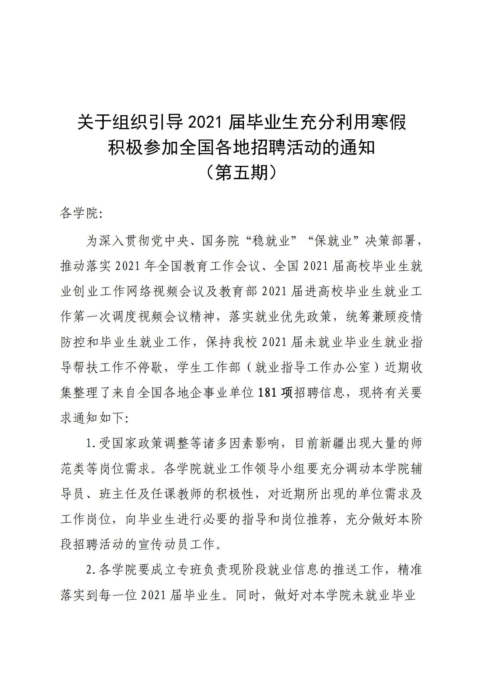 关于组织引导2021届毕业生充分利用寒假积极参加全国各地招聘活动的通知(第五期)